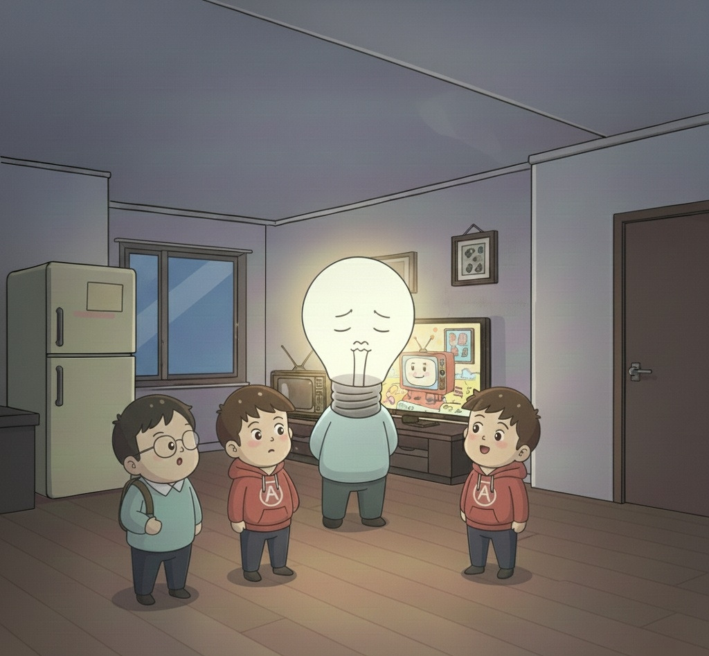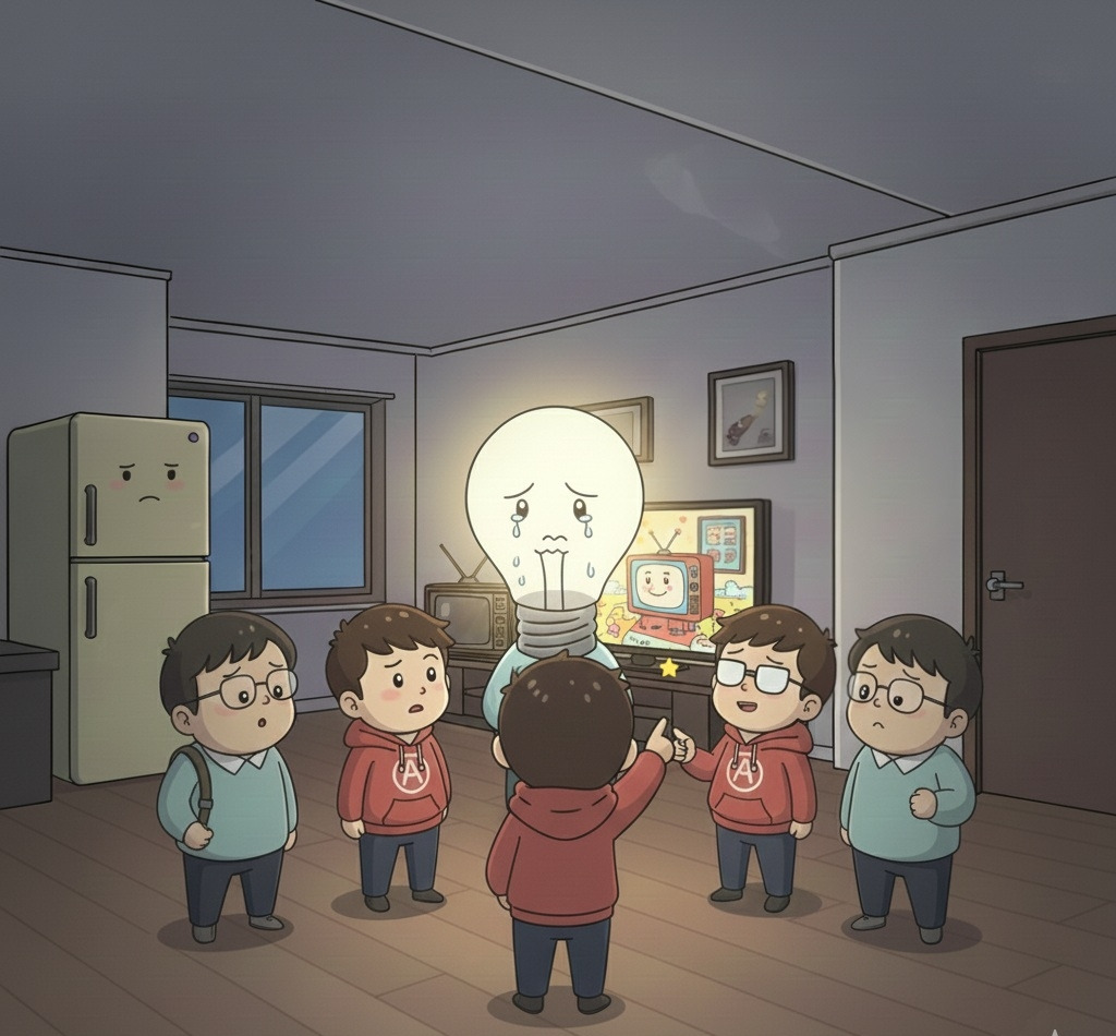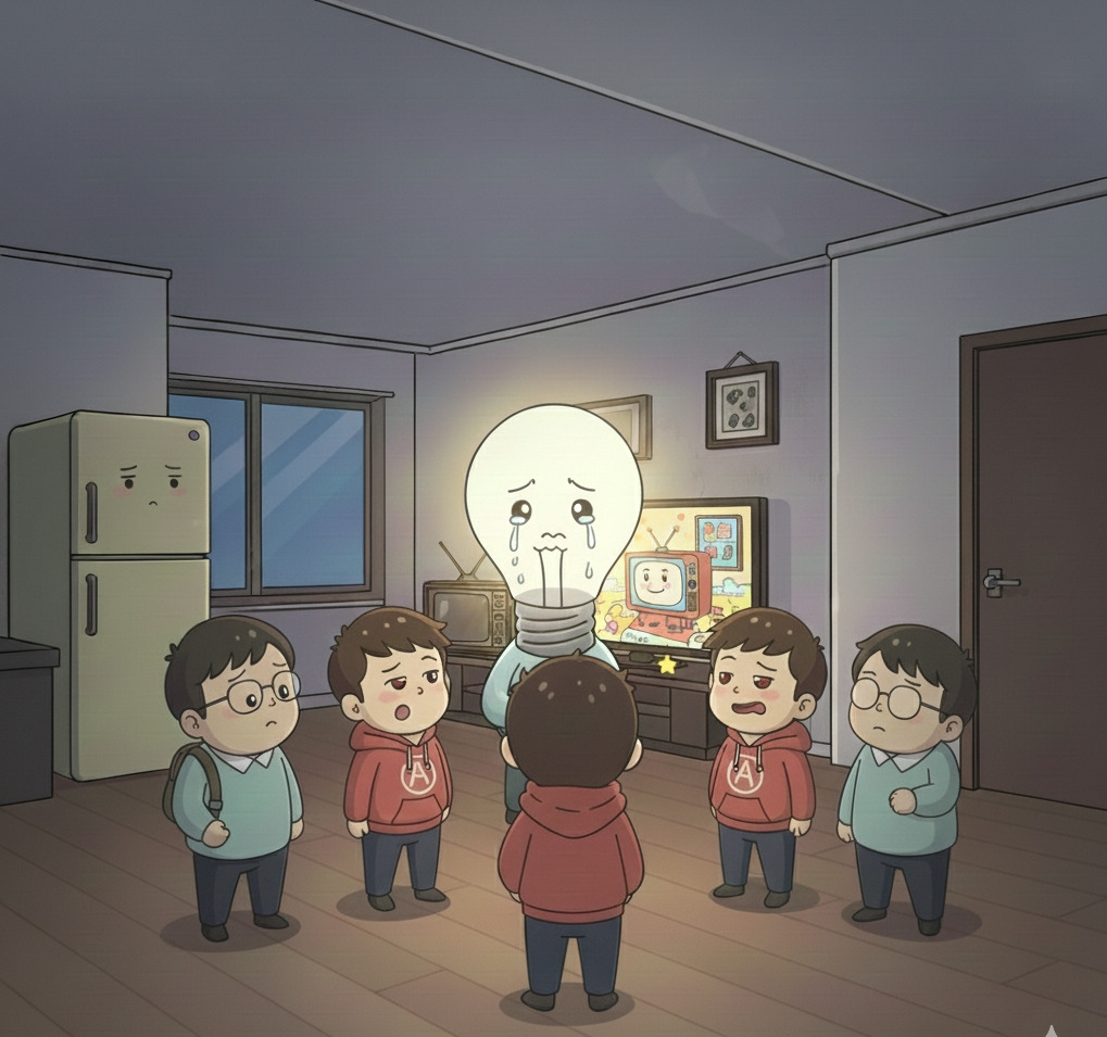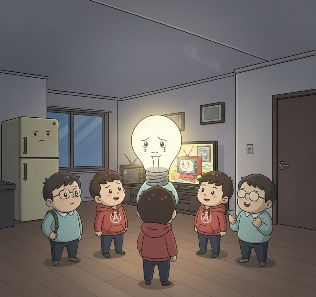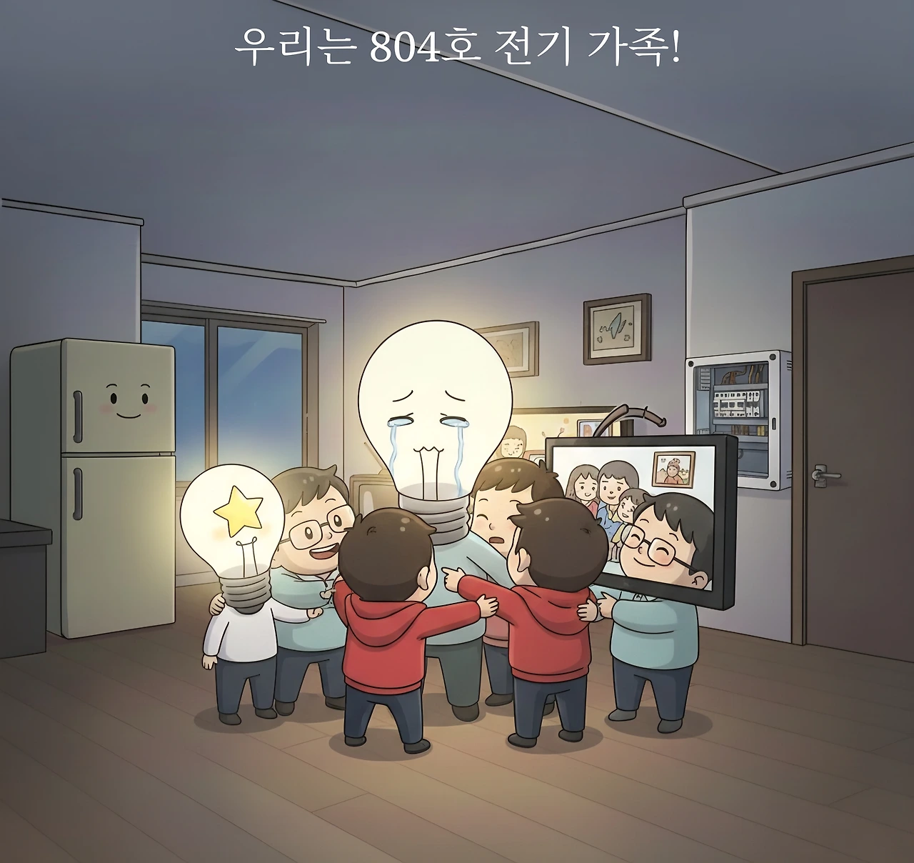 갑자기 전류군이 외치며 모두를 끌어안았다. 냉장고, 김치냉장고, 저항씨, 심지어 새로 온 텔레비전과 LED 조명, 보일러까지 모두 한데 모였다.