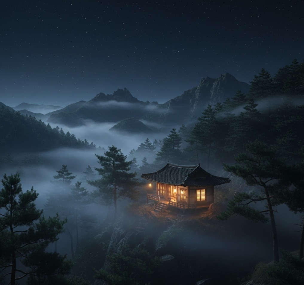 숨이 턱까지 차올랐을 때, 그는 드디어 산골 외딴집의 희미한 불빛을 보았다.