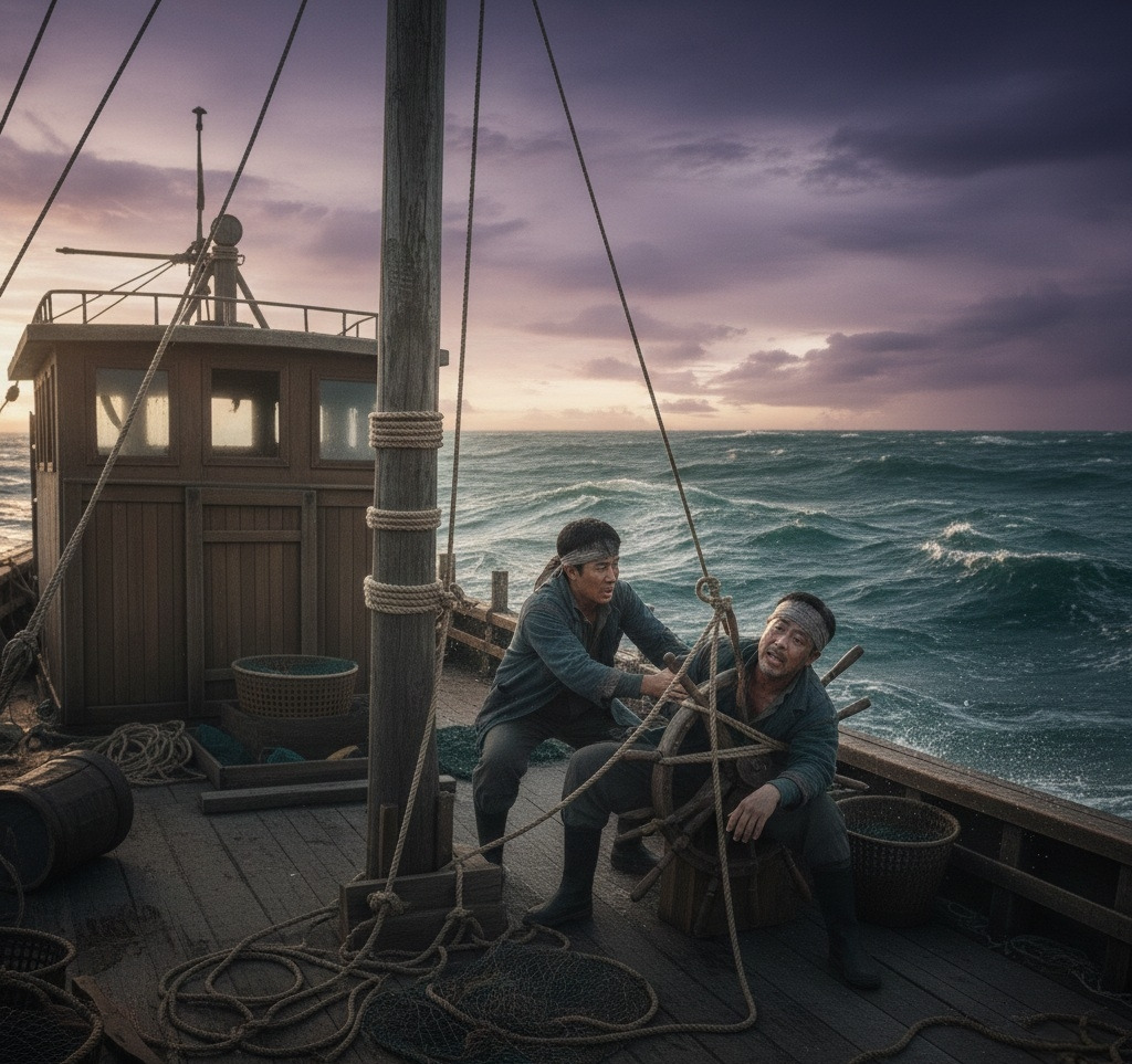 동이 틀 무렵, 폭풍이 잦아들었다. 백정치는 간신히 선실에서 나왔다. 갑판은 난장판이었다. 그물은 찢어졌고, 돛대는 부러졌으며, 삼돌은 키에 묶인 채 쓰러져 있었다.