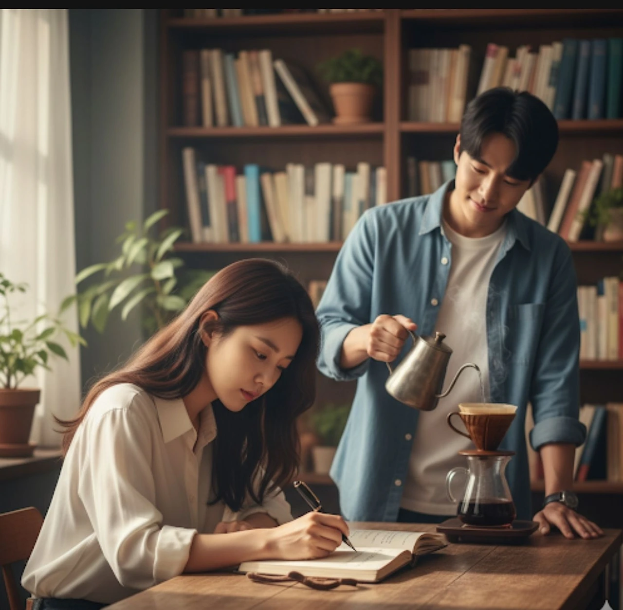 그날 저녁, 두 사람은 책방 구석에 앉아 조용히 이야기를 나눴다.