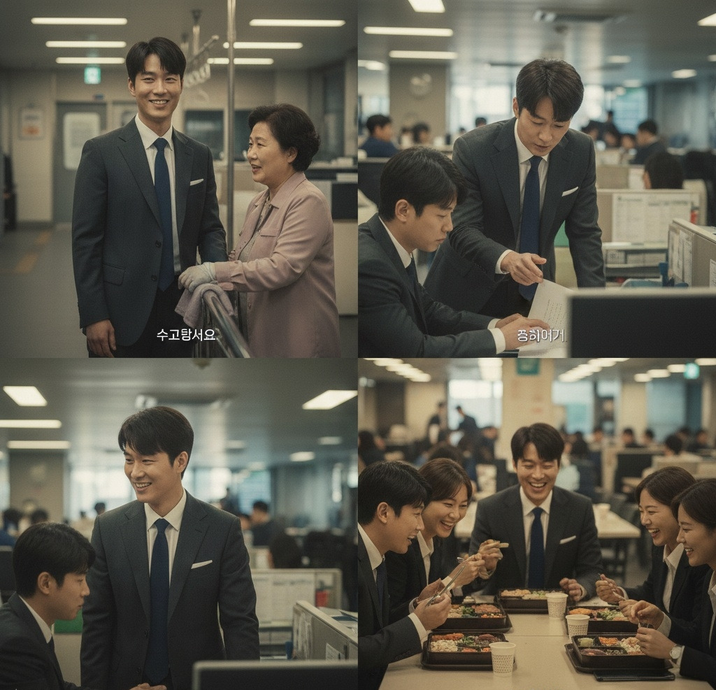 회사에 도착한 민준은 평소와 다른 아침을 맞았다. 청소하시는 아주머니께 "수고하세요"라고 인사했고, 신입사원의 서류를 함께 검토해 주었다. 점심시간엔 혼자 먹던 식사를 동료와 함께했다.