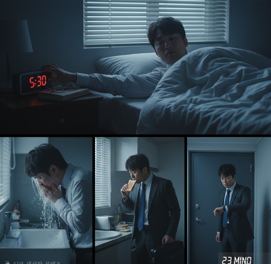 새벽 5시 30분, 알람이 울렸다. 김민준은 습관처럼 손을 뻗어 알람을 끄고 일어났다. 37세, 중견 기업 과장. 15년째 같은 루트로 출근하고 있었다. 세수를 하고, 토스트를 입에 물고, 현관문을 나서는 시간까지 정확히 23분. 그의 아침은 언제나 기계처럼 정확했다.