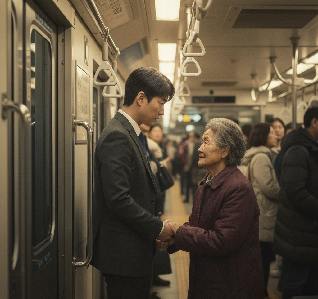그날따라 지하철이 유난히 붐볐다. 민준이 잡은 손잡이에 다른 손이 함께 올려졌다. 깜짝 놀라 고개를 들자, 70대쯤 되어 보이는 할머니가 서 계셨다. 주름진 얼굴에 미안한 듯한 미소를 띠고 있었다.