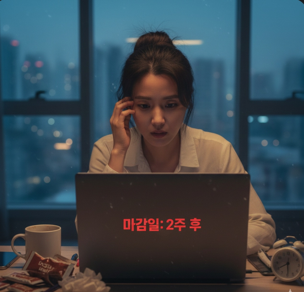 고요한 새벽 3시, 도시의 소음이 잦아든 시간. 윤슬은 노트북 화면 앞에서 흐트러진 머리를 쓸어 올렸다. 모니터에는 '마감일: 2주 후'라는 붉은 글씨가 위협적으로 깜빡이고 있었다. 그녀의 눈 밑에는 짙은 다크서클이 드리워 있었고, 책상 위에는 며칠 전 '건강을 위해 끊겠다'라고 맹세했던 인스턴트커피 봉투가 수북이 쌓여 있었다.