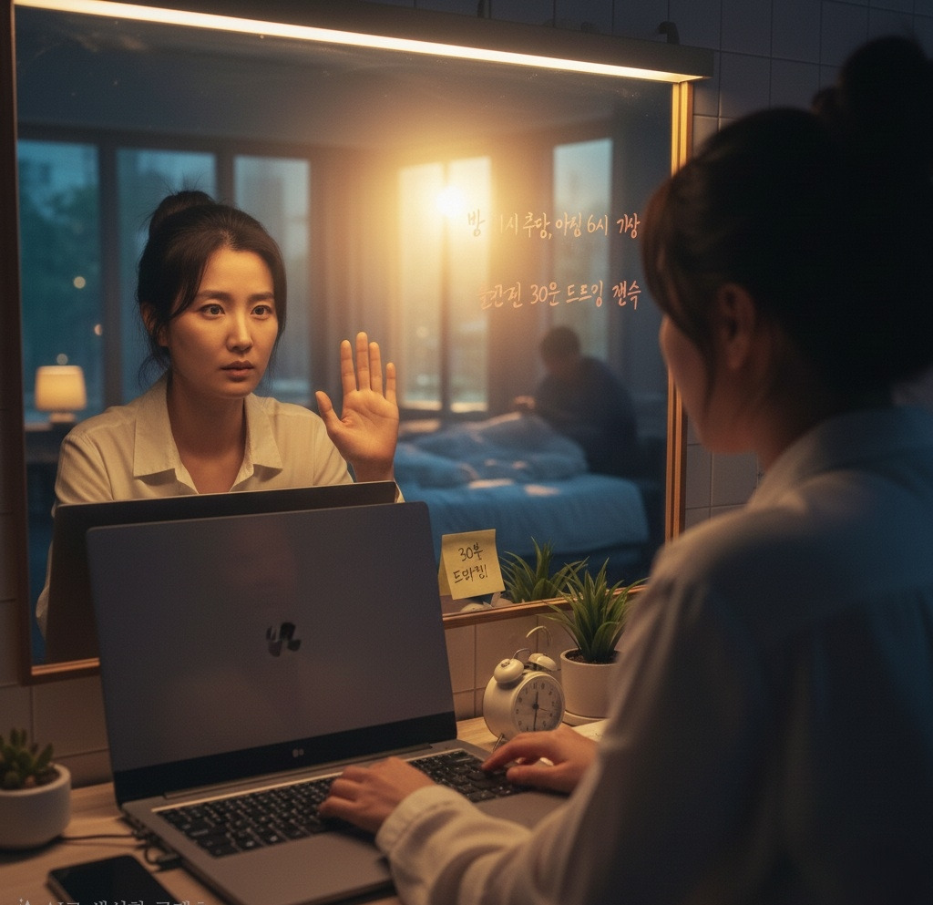 "윤슬, 이제 밤샘 작업은 없다. 매일 밤 11시 취침, 아침 6시 기상. 그리고 출근 전 30분 동안 드로잉 연습을 할 것!" 그녀는 그 순간 진심이었다. 번아웃 직전의 피로와 창의력 고갈에 대한 절박함이 그녀를 그 맹세로 이끌었다.
