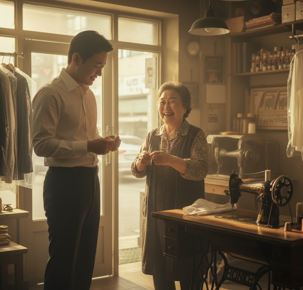 그의 시선이 창밖으로 향했다. 저 아래 어딘가에 할머니의 세탁소가 있었다. 50년간 한 자리에서, 한 땀 한 땀 사람들의 소중한 순간을 돌봐온 곳.