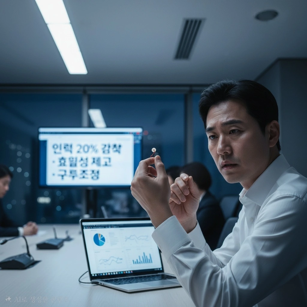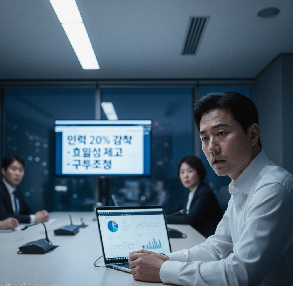 재혁은 고개를 들었다. 회의실 스크린에는 차갑게 정리된 숫자들이 빼곡했다. '인력 20% 감축', '효율성 제고', '구조조정'.