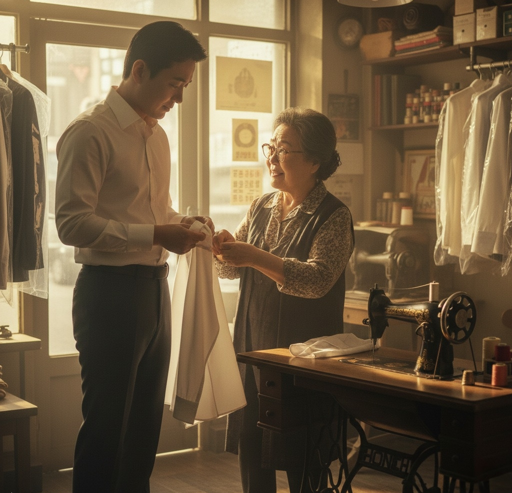 "50년을 여기서 이 일을 했어요. 사람들이 중요한 날 입을 옷들을 돌봐왔죠. 결혼식, 면접, 장례식... 옷은 그냥 천이 아니에요. 그 사람의 순간이죠."