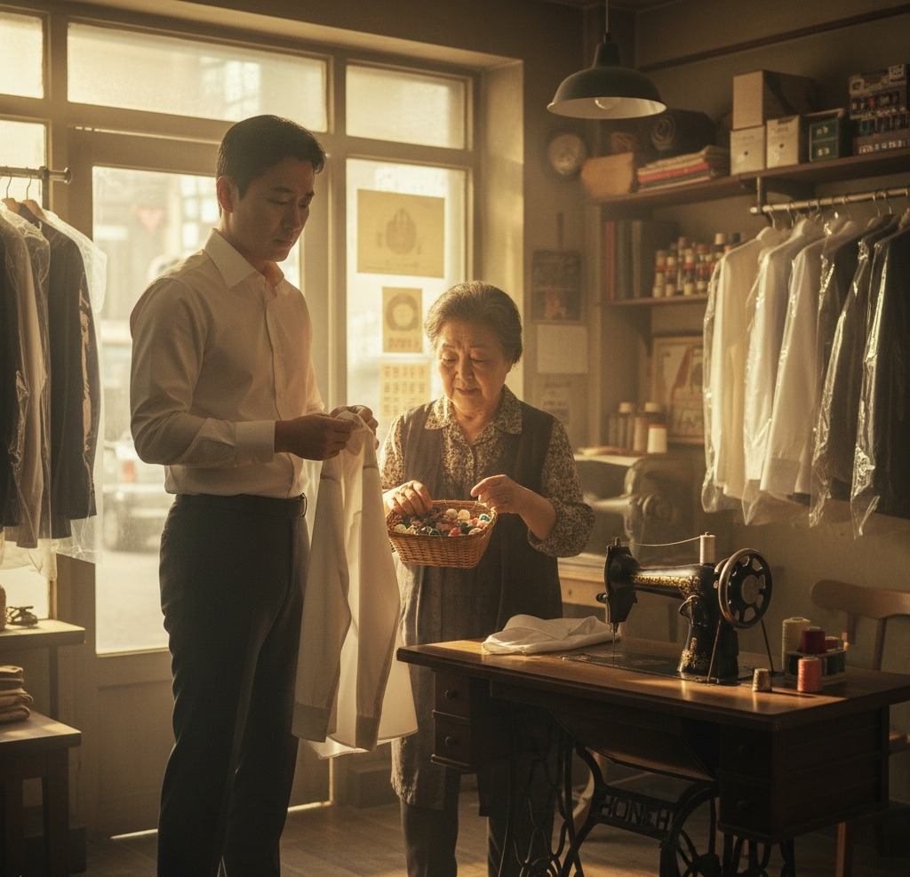 할머니의 손은 주름투성이었지만 놀라울 만큼 정확했다. 바늘이 천을 뚫고 들어가고, 실이 단추 구멍을 감쌌다.
