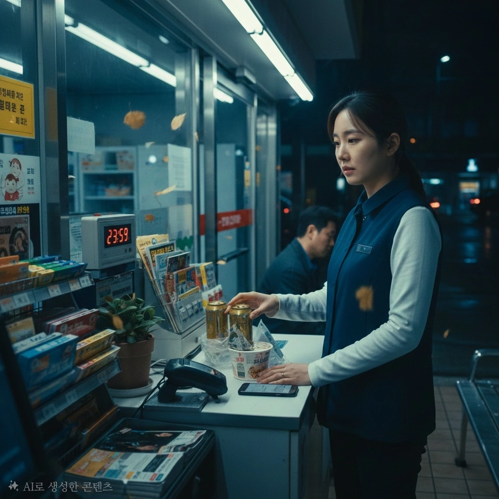 김수현, 27세. 그녀는 편의점 카운터 뒤에서 시계를 바라보았다. 밤 11시 59분. 곧 자정이었다. 그리고 자정이 지나면 또 하루가 시작되었다.