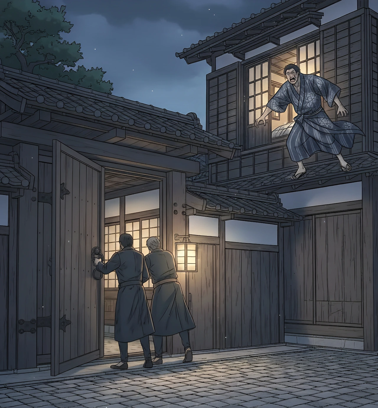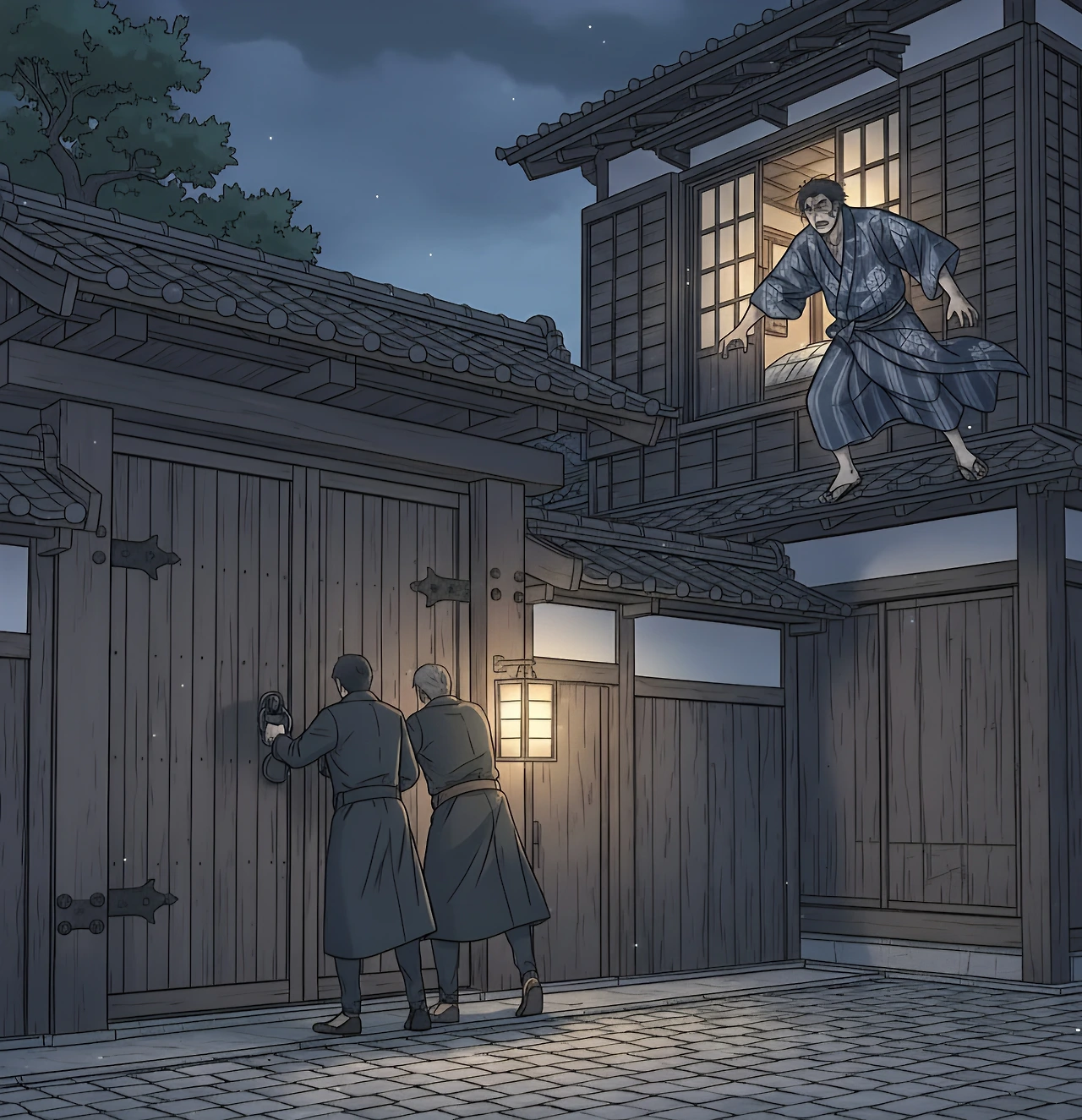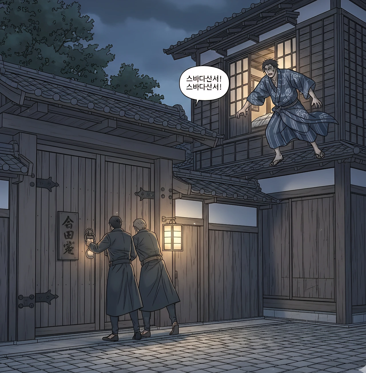 2층 침실에서 잠들어 있던 시마다 겐죠가 벌떡 일어났다. 유카타 자락을 휘날리며 창가로 달려가 밖을 내려다봤다.