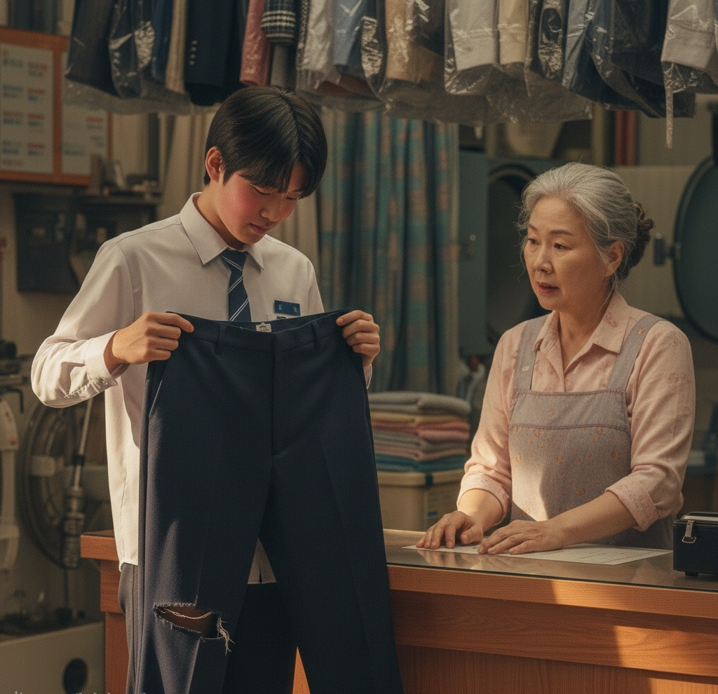 고등학생 남학생이었다. 교복 바지를 들고 있었다.