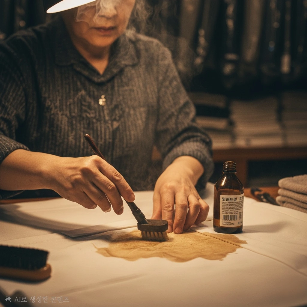 얼룩 제거제를 바르고, 조심스럽게 문질렀다. 하지만 얼룩은 쉽게 빠지지 않았다.