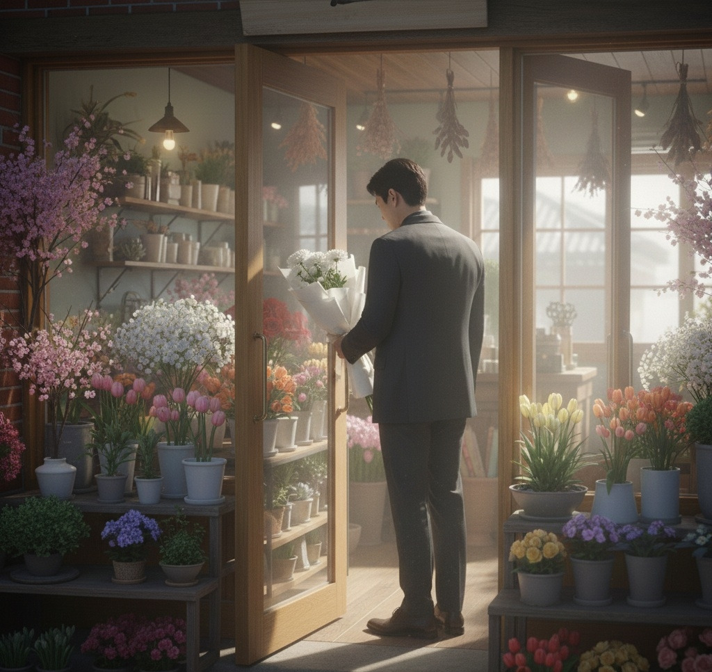 남성은 고개를 끄덕이며 꽃을 받아 나갔다.