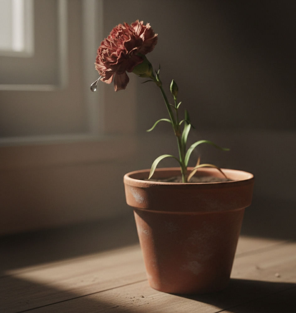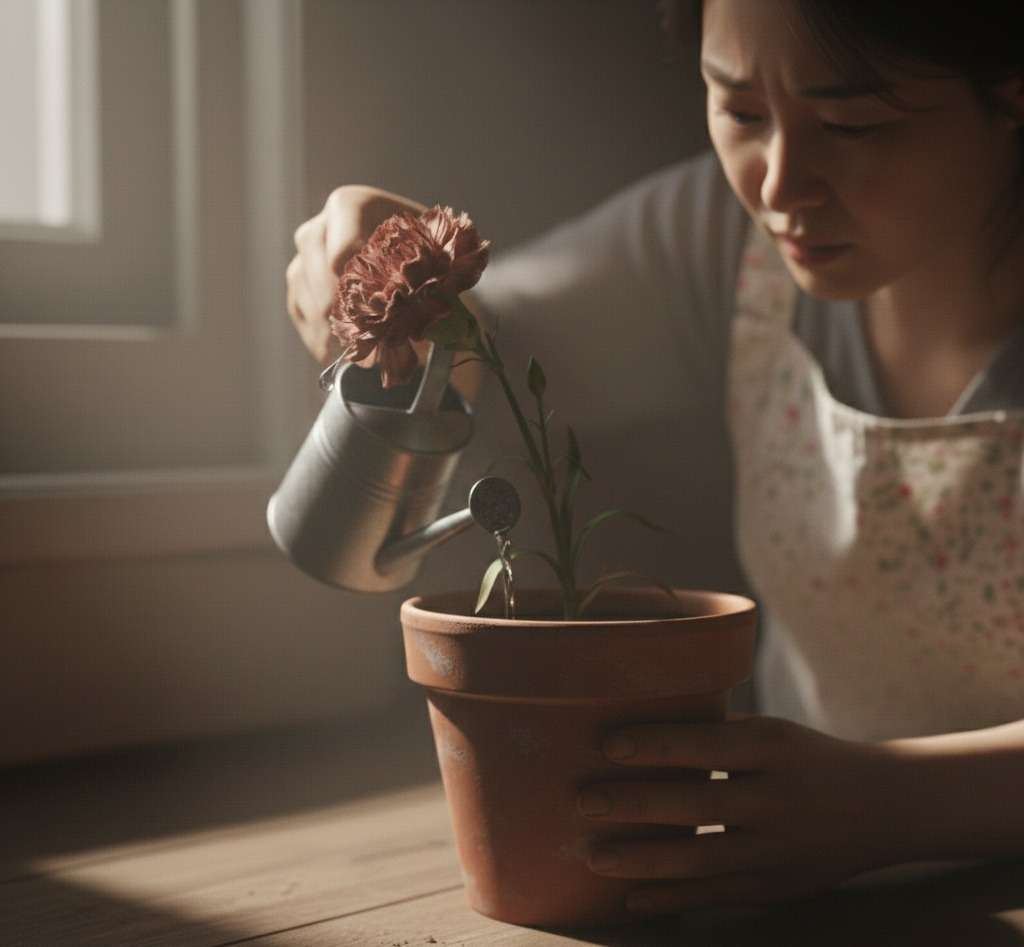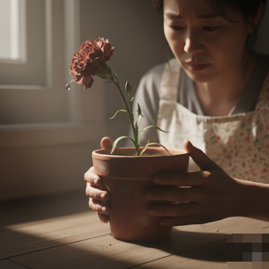 하지만 구석에 있는 화분 하나가 눈에 들어왔다. 카네이션이었는데, 꽃잎이 시들어 있었다.