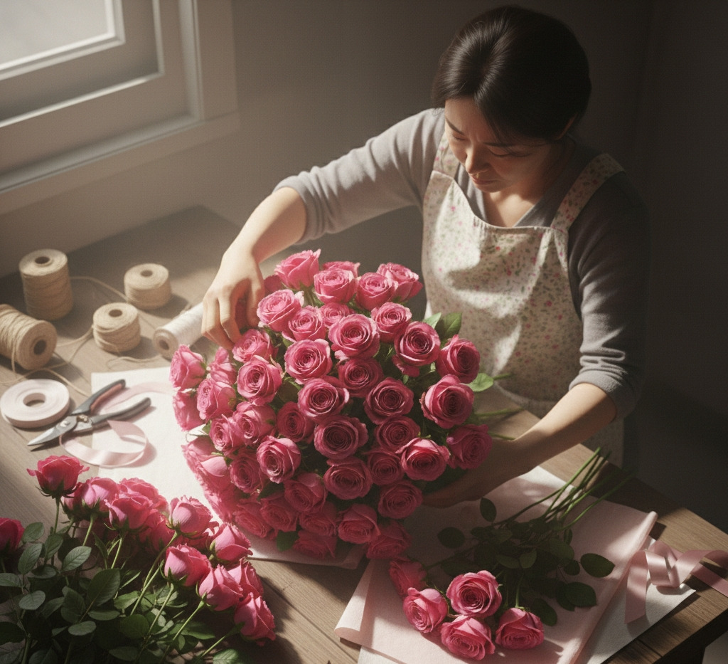 미영은 정성스럽게 꽃을 포장하기 시작했다.