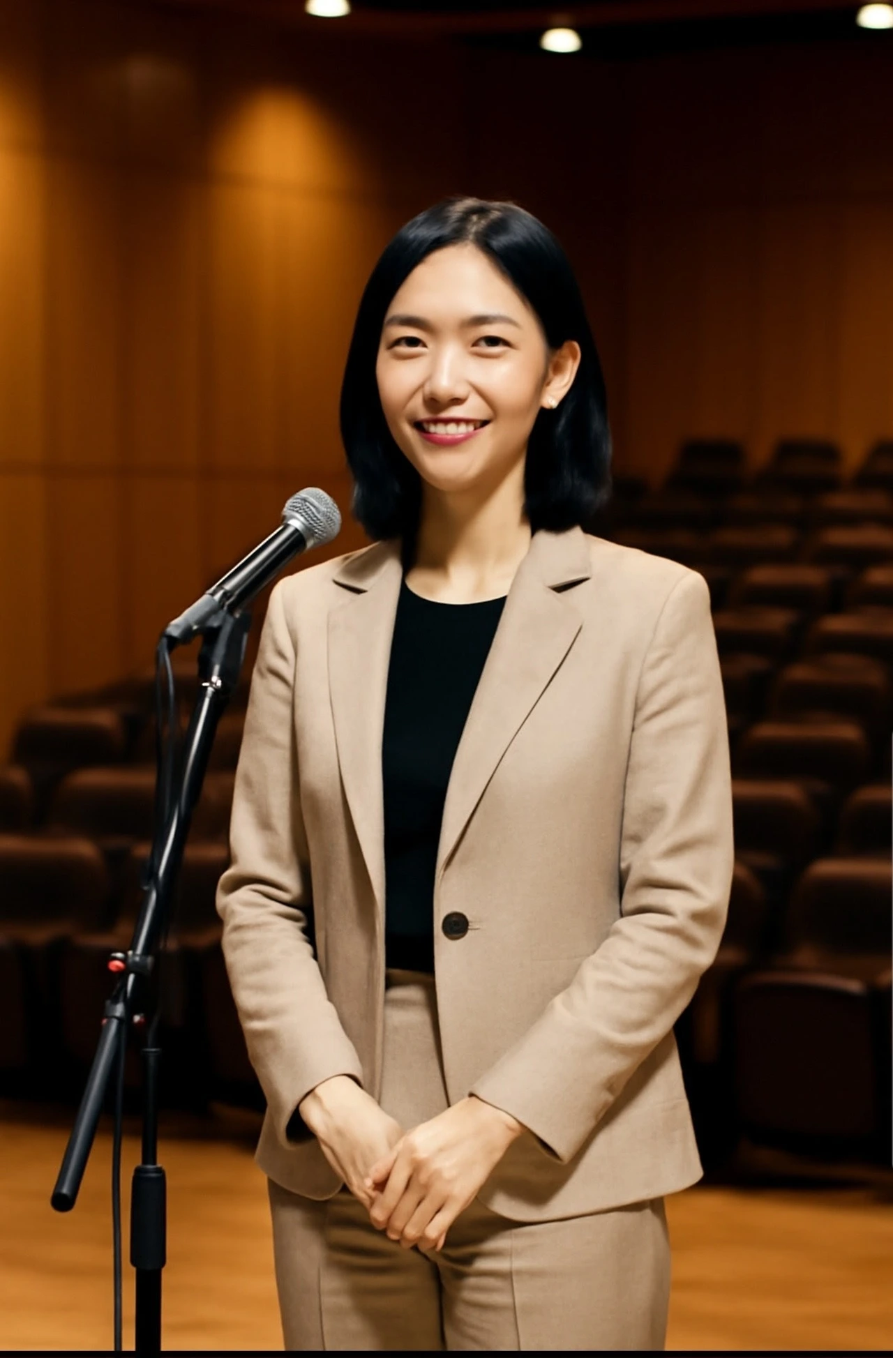 그녀는 마이크 앞에 섰다.