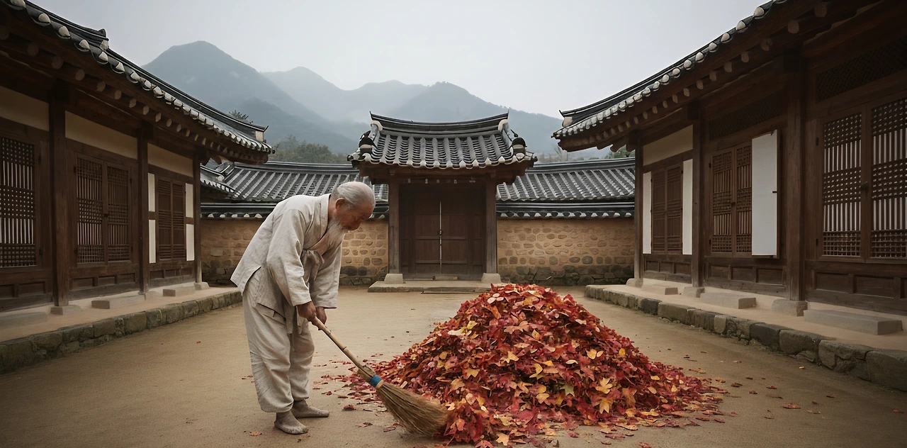 이복은 마당에서 낙엽을 쓸고 있었다.