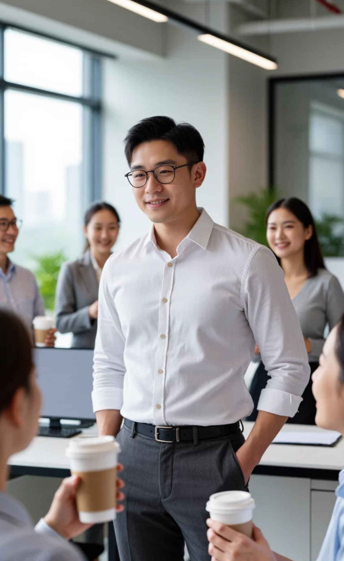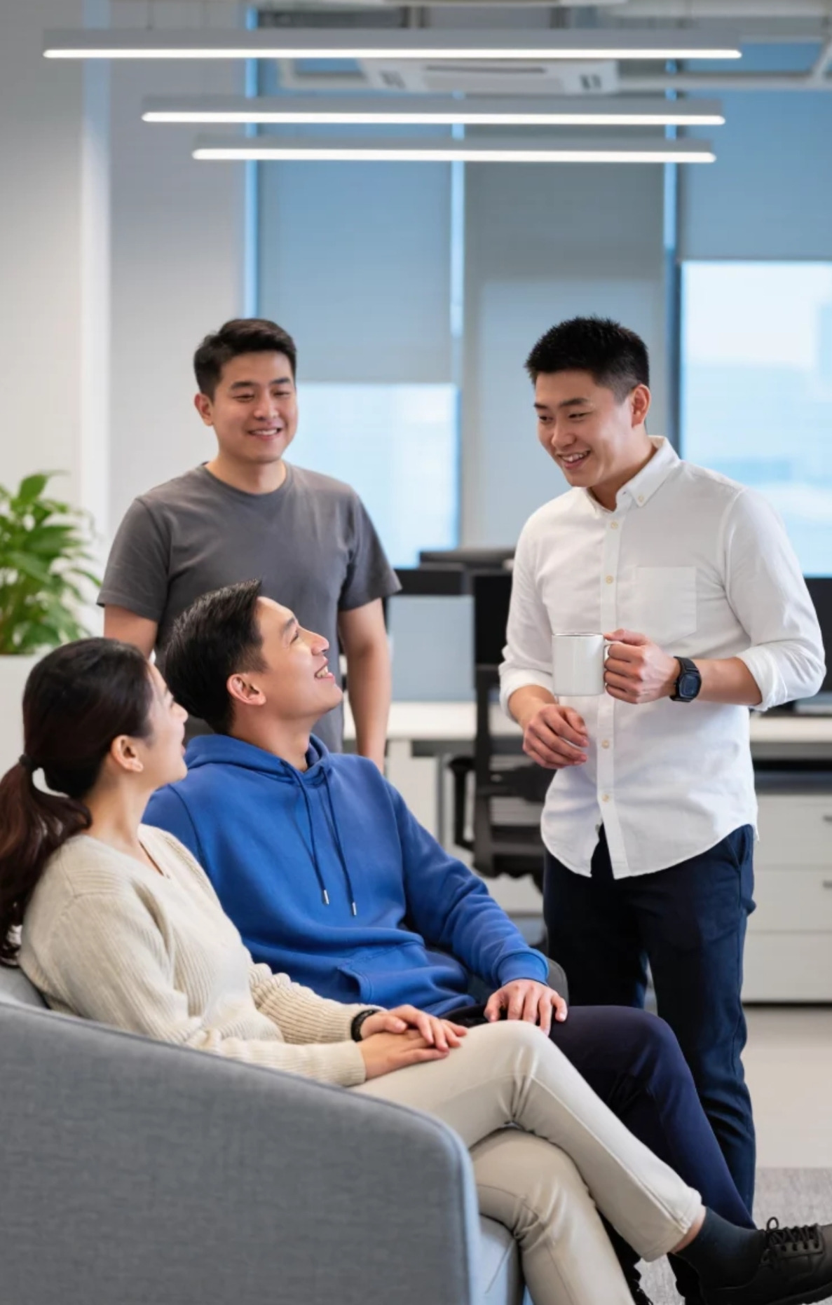 회사에 도착한 지우는 동료들과 커피를 마시며 잡담을 나눴다.