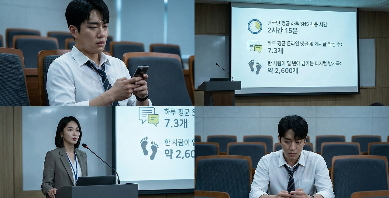 "한국인 평균 하루 SNS 사용 시간: 2시간 15분. 하루 평균 온라인 댓글 및 게시글 작성 수: 7.3개. 한 사람이 일 년에 남기는 디지털 발자국: 약 2,600개."