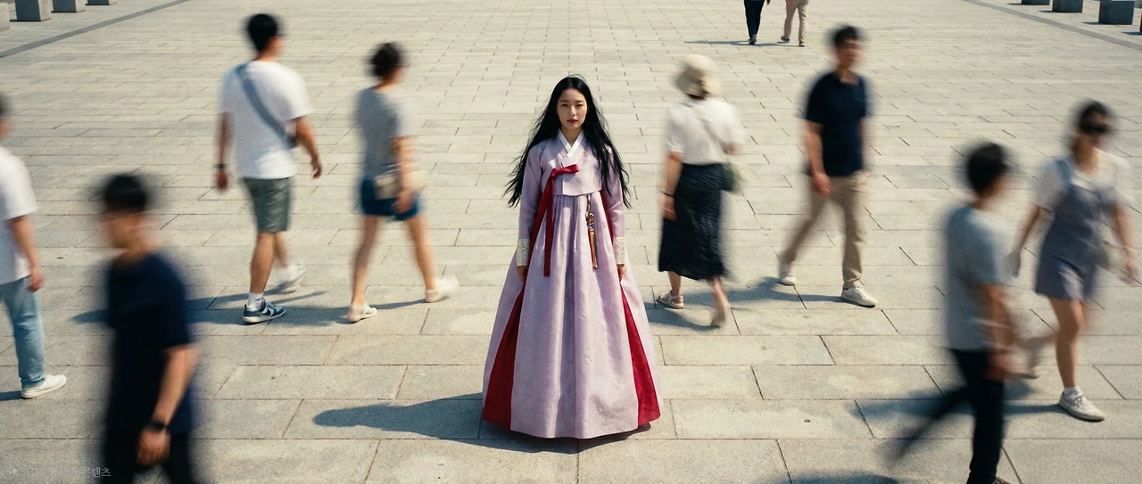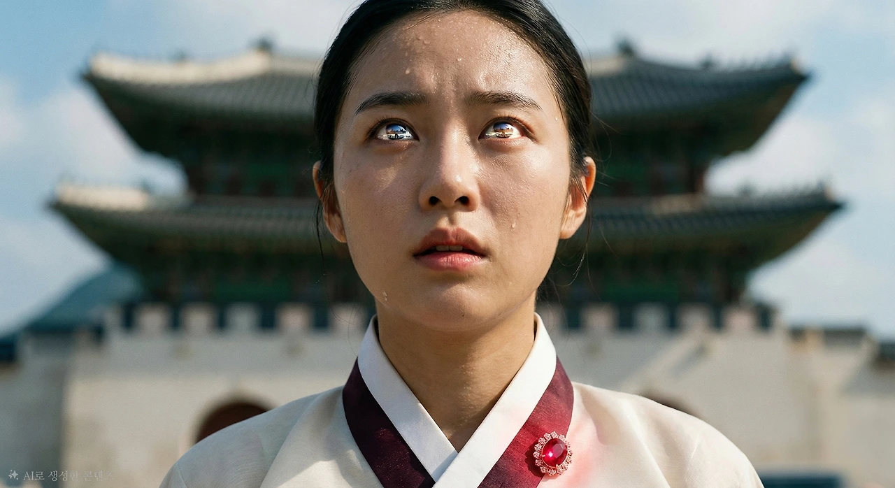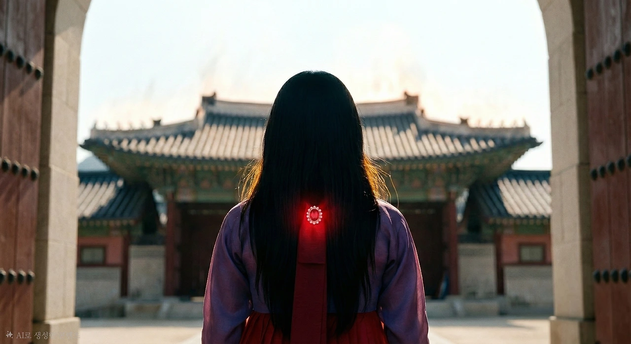 허리까지 내려오는 검은 머리, 연보랏빛과 붉은빛이 어우러진 우아한 한복, 그리고 가슴 중앙에 선명한 붉은 심지처럼 빛나는 루비 브로치가 그녀의 정체를 암시했다.