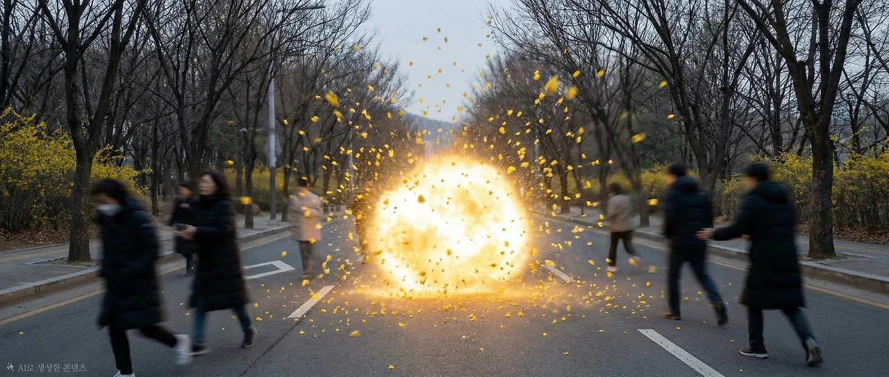 그 순간, 윤중로 개나리 터널 한가운데서 황금빛 섬광이 터져 나왔다.
