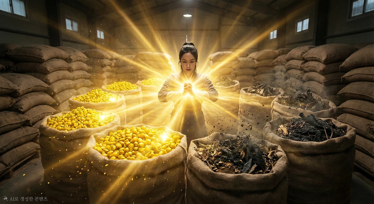 순수한 개나리의 기운이 창고 안 모든 약재를 감쌌다. 가짜들은 검은색으로 변했고, 진짜 한국산 연교만이 황금빛으로 빛났다.