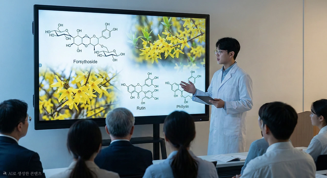 "연교에는 포르시토사이드(Forsythoside), 루틴(Rutin), 필리린(Phillyrin) 등의 성분이 풍부합니다. 이들은 항균, 항염, 항산화 작용을 합니다. 특히 한국산 개나리는 이 성분의 함량이 다른 종보다 20-30% 높습니다."