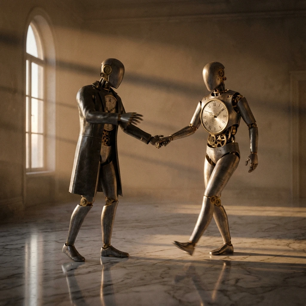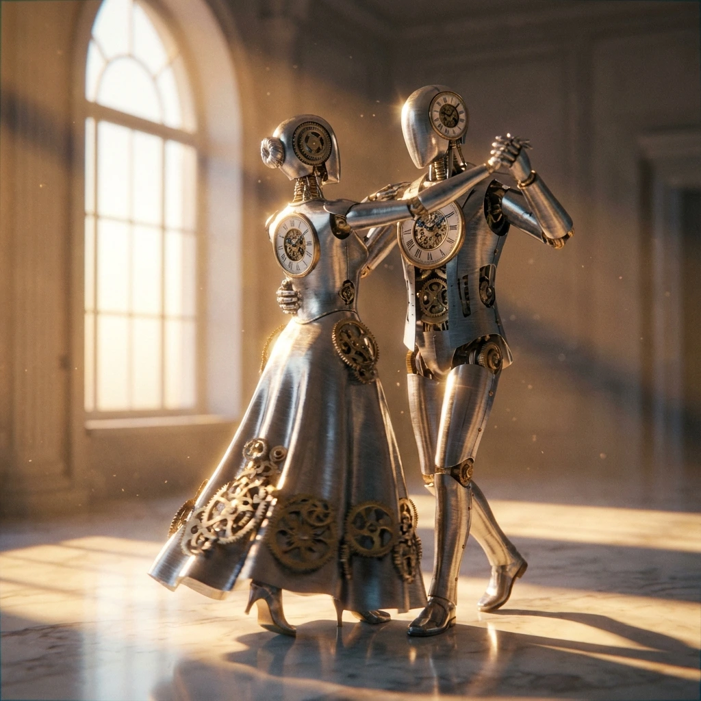 그들의 발걸음이 대리석 위에서 리듬을 만들어냈다. 초침이 돌아가는 소리와 어우러져 하나의 멜로디가 되었다. 두 시계는 천천히, 조심스럽게 춤을 추었다. 넘어질까 봐 서로를 붙잡고, 균형을 잃을까 봐 서로를 지탱하며.