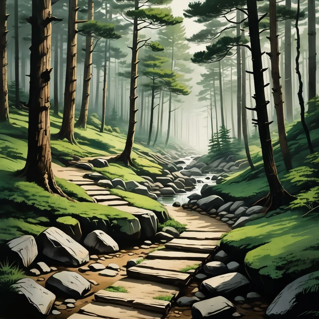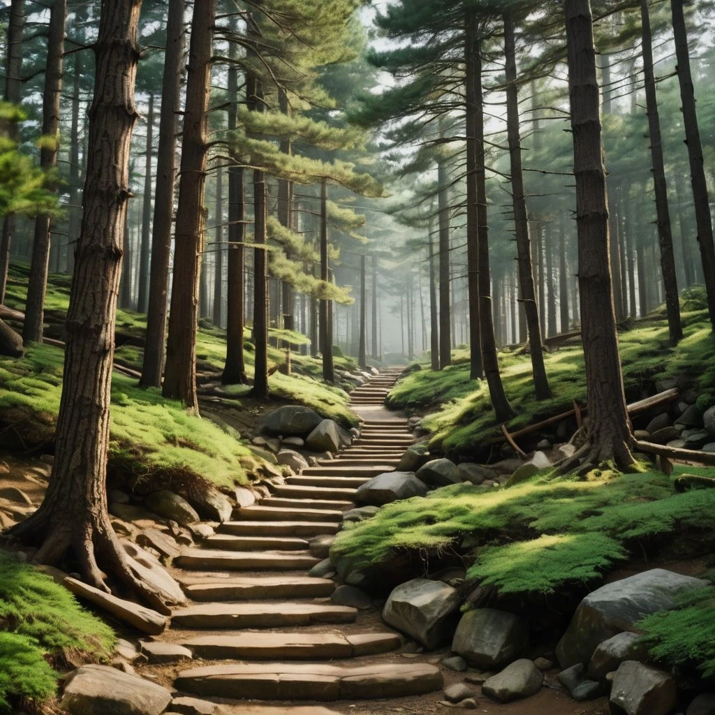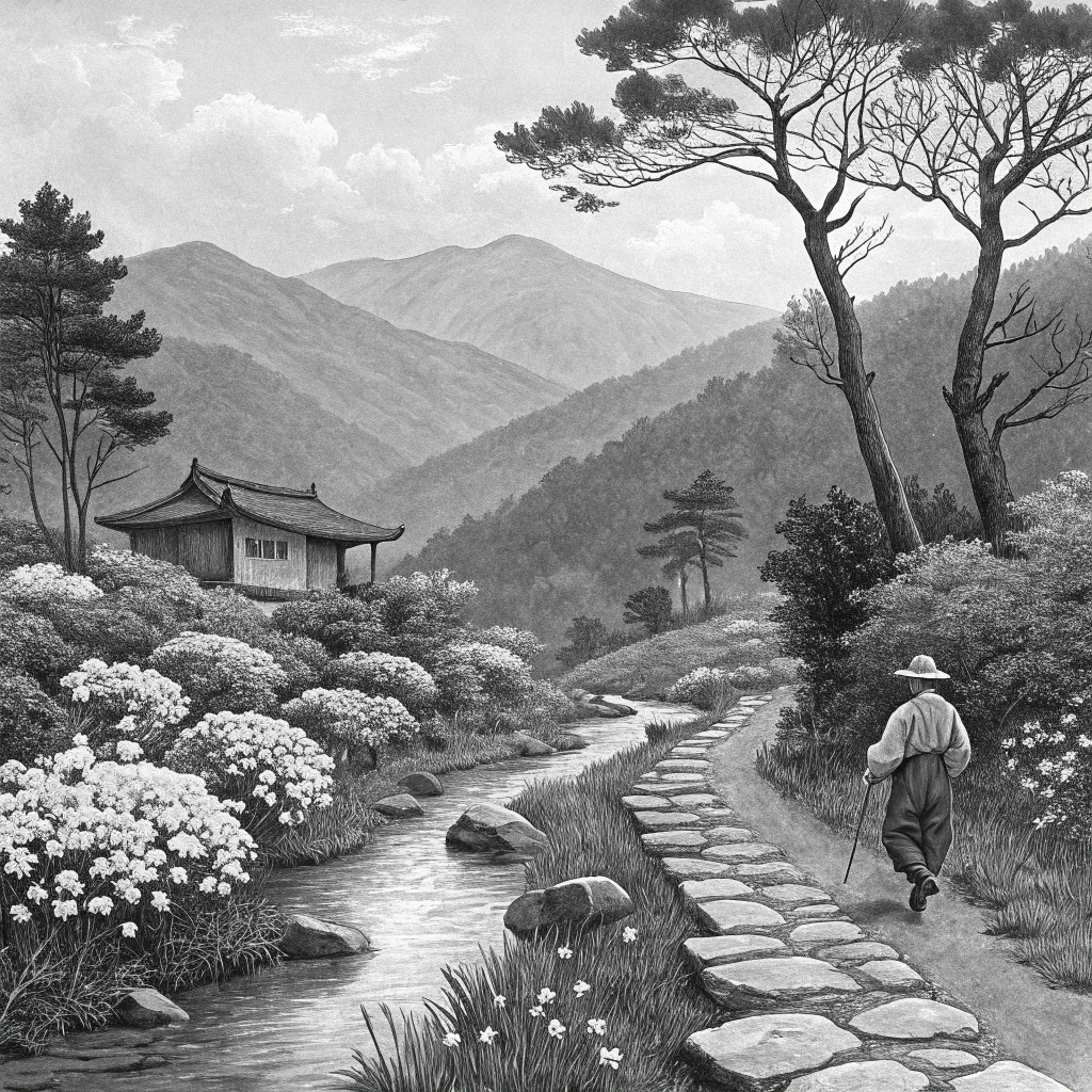 울창한 소나무 그늘이 펼쳐진 곳에 이르면, 마치 한 폭의 동양화 속으로 들어온 듯한 착각에 빠진다. 소나무의 짙은 초록빛 그늘은 햇빛마저도 맑고 서늘하게 거르고, 그 아래서의 휴식은 마음의 평화를 가져다준다. 길섶 섬돌에 적힌 이정표를 뒤로하고 한참을 또다시 걸어가다 보면, 산 어귀의 시냇물 위를 돌로 채워놓은 징검다리를 만나게 된다.