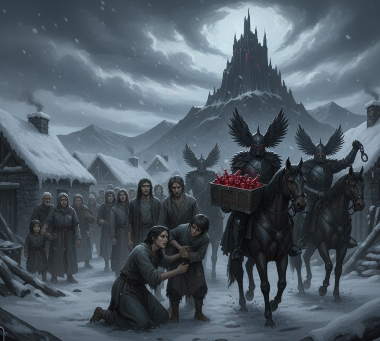 "핏빛 세금... 차라리 늑대 떼가 몰려와 마을을 덮치는 것이 나았을 겁니다." 카이는 늑대 가죽을 다듬으며 중얼거렸다.