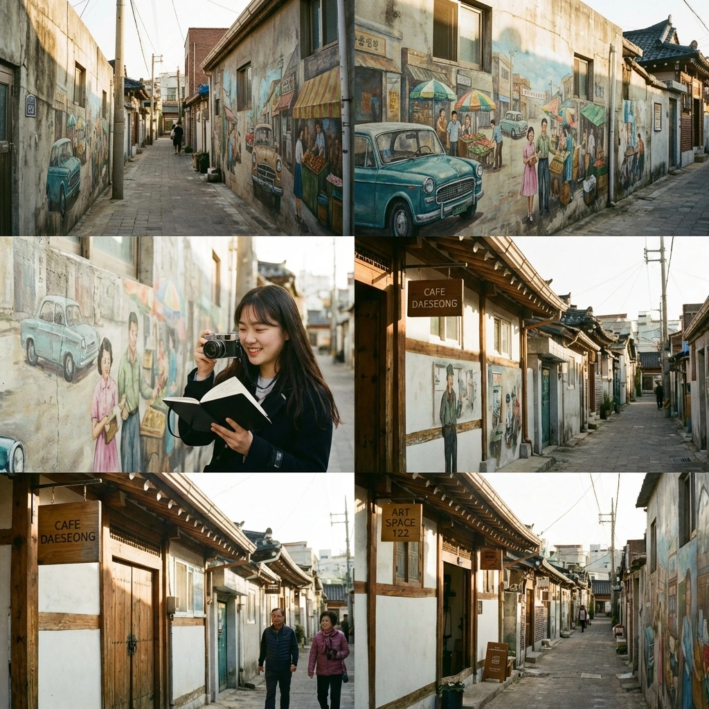 "친구가 추천해줬어. 옛날 도심에 예술가들이 모여서 만든 골목이래. 벽화도 있고, 작은 갤러리들도 있고."