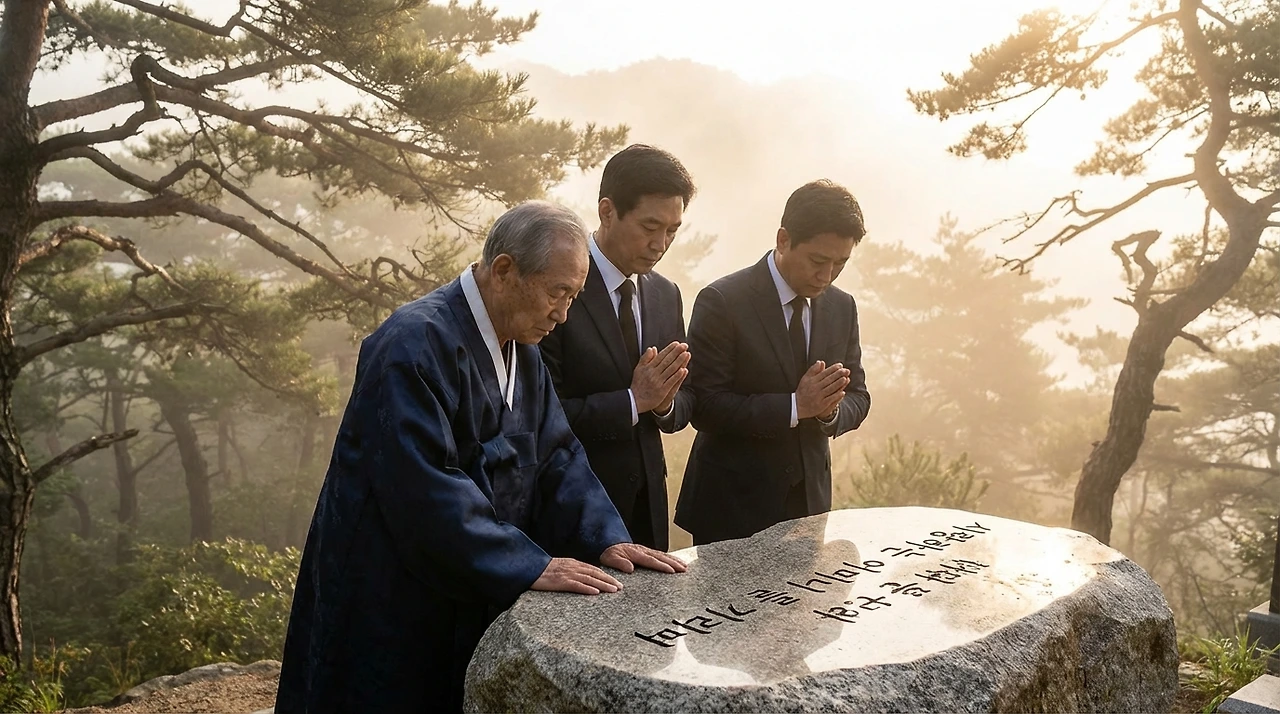 두 아들이 아버지 무덤 앞에 무릎을 꿇었다.