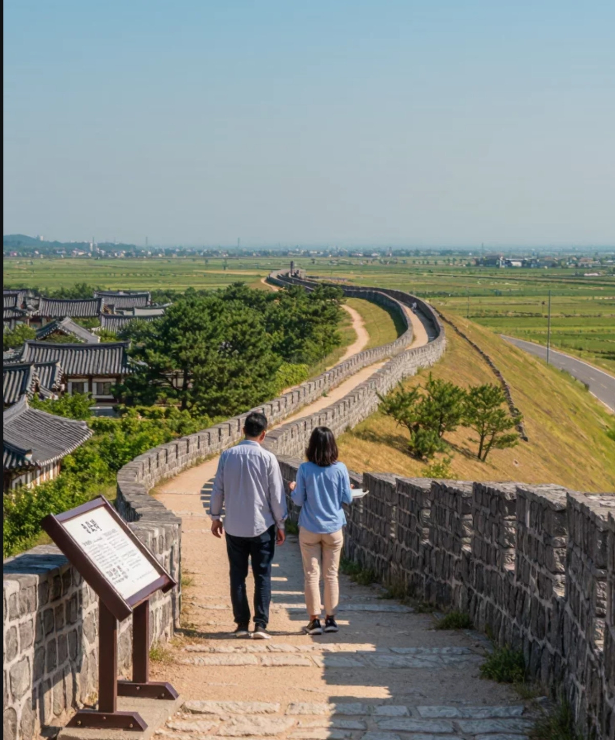 성벽 위에서 보는 풍경은 장관이었다. 한쪽으로는 성 안 마을이, 다른 쪽으로는 서산 평야가 펼쳐졌다.