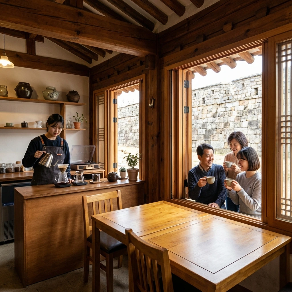 "응. 500년 전 성벽이랑 현대 커피의 조합."