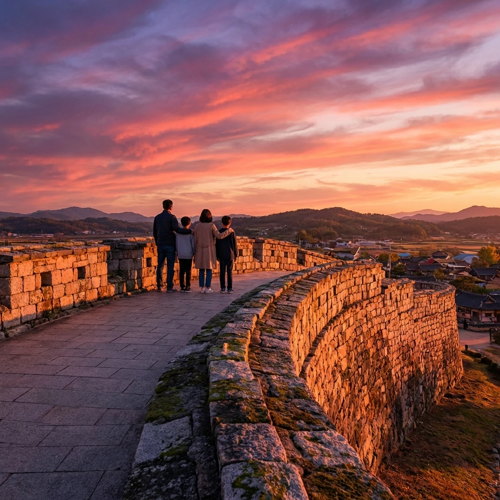 석양을 배경으로 성벽 위에서 가족 사진을 찍었다.