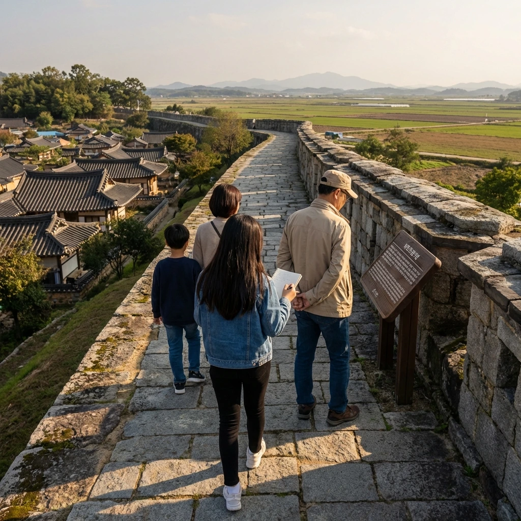 "해미읍성은 1491년에 축조된 조선시대 읍성이야. 둘레가 1.8킬로미터. 성벽이 거의 완전하게 남아있어."