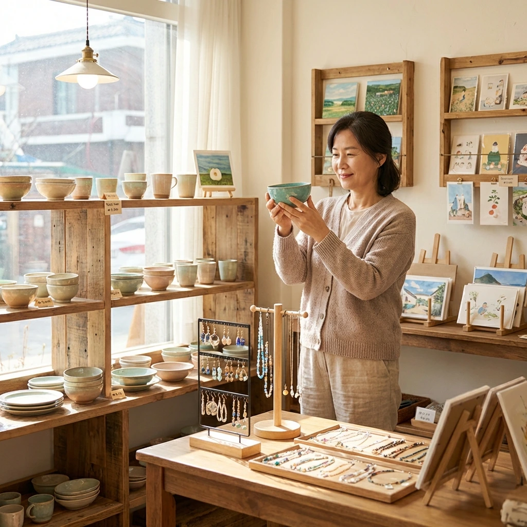 '작은 것들의 가게'라는 이름의 소품샵이었다. 핸드메이드 악세서리, 엽서, 작은 그림들이 진열되어 있었다.