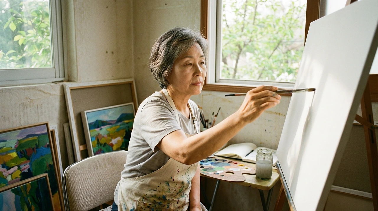 그녀는 가장 기본적인 것들만 골랐다. 수채화 물감, 붓 세 자루, 스케치북. 총 이만사천 원. 그것이 사십삼 년 만에 다시 시작하는 데 든 비용이었다.