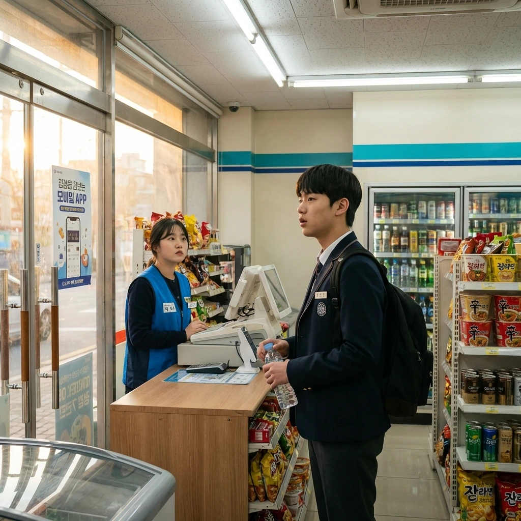 다음 날 아침, 도현은 학교에 가는 길에 편의점에 들렀다. 아버지가 야간 근무하는 곳이 아닌, 집 앞의 다른 편의점이었다. 도현은 생수 한 병을 집어 들고 계산대 앞에 섰다.