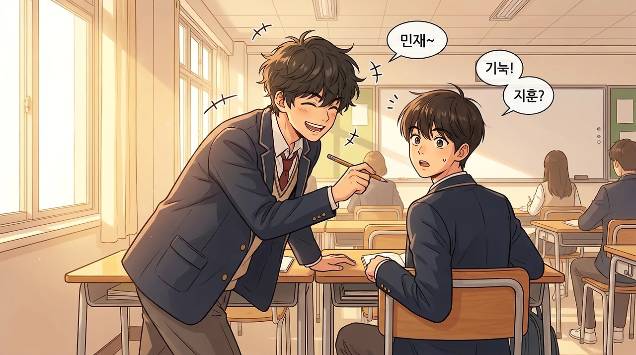 민재가 연필로 지훈을 톡 치는 장난스러운 순간