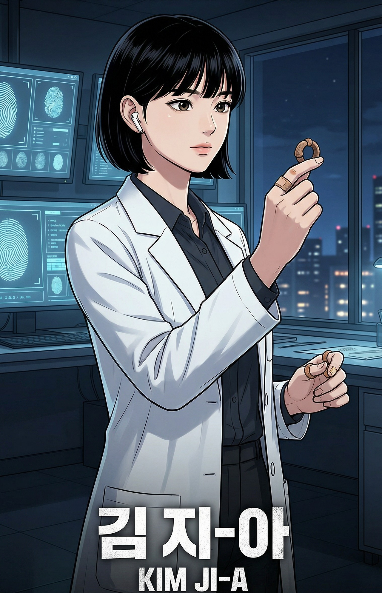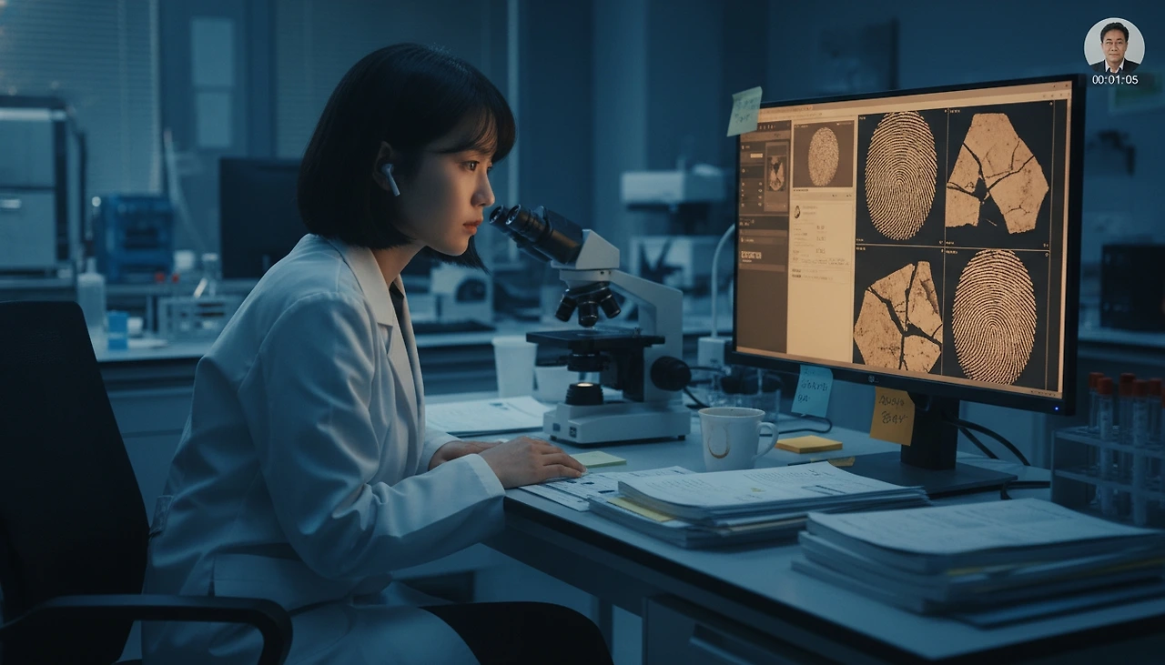화면에 나타난 얼굴은 김지아였다. 짧은 단발에 흰 가운, 귀에 한쪽 이어폰을 꽂은 채 현미경 옆에 앉아 있었다. 과학수사연구원에서 지문 분석을 담당하는 그녀가 밤샘 근무 중이라는 건 보지 않아도 알 수 있었다.