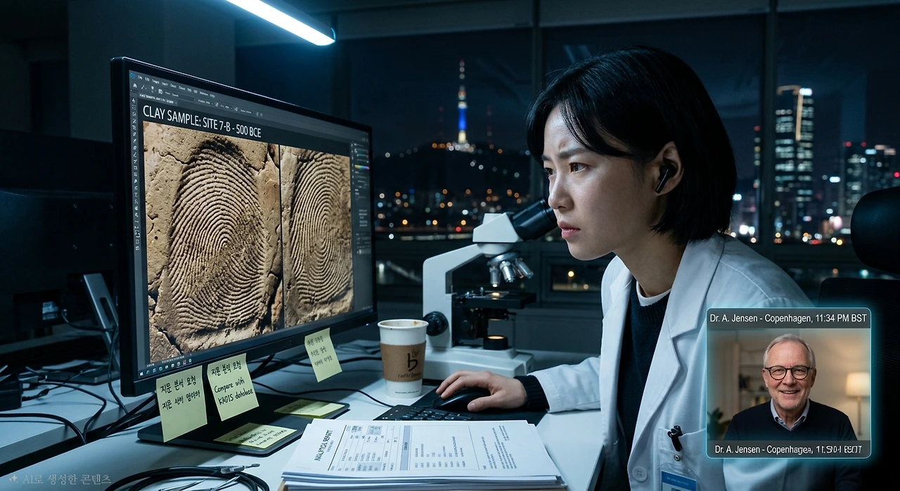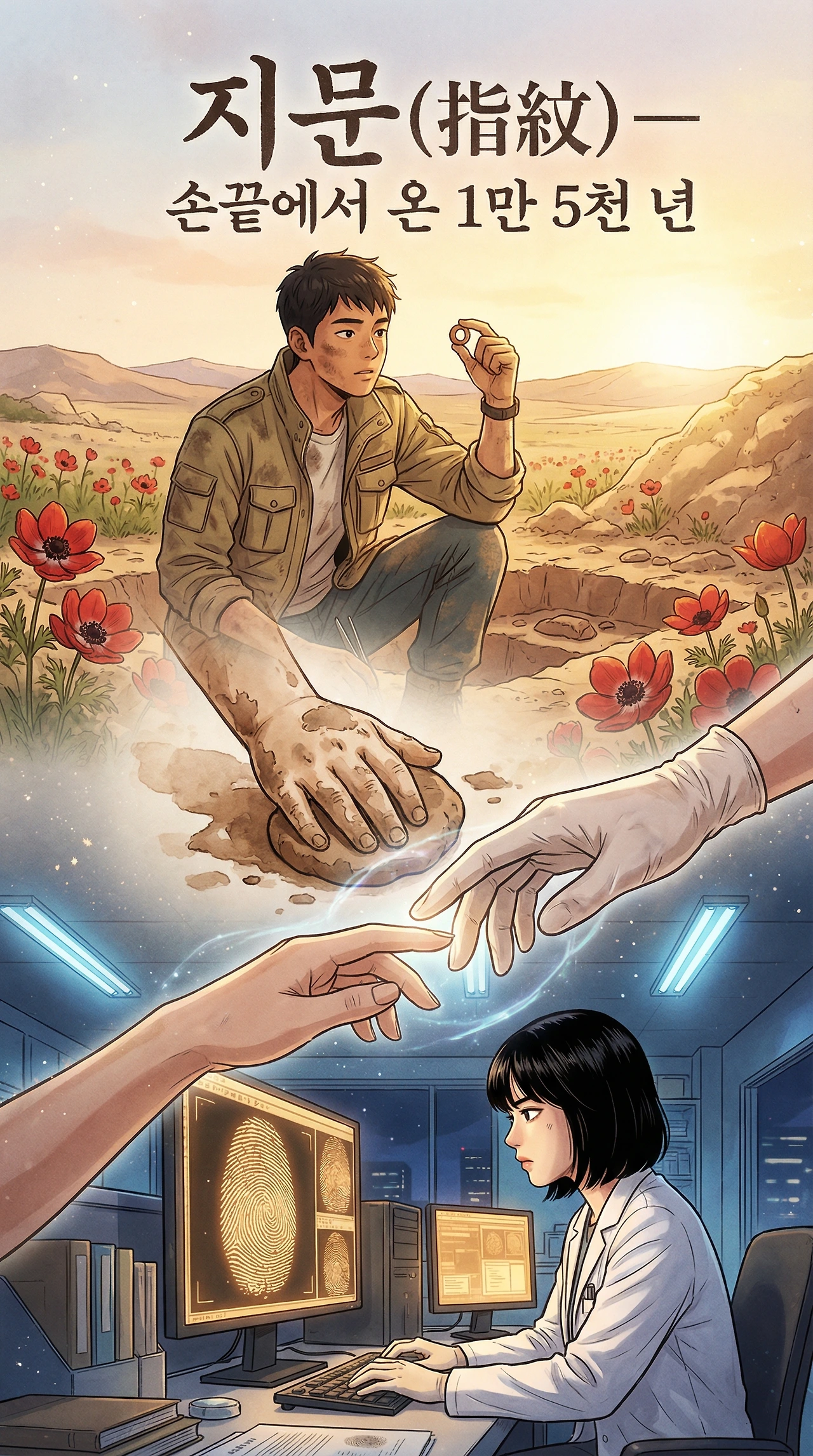 서준은 모니터 화면을 바라봤다. 두 개의 지문이 나란히 점토 위에 찍혀 있었다. 어른의 크고 넓은 지문과, 아이의 작고 촘촘한 지문이. 1만 5,000년이 지난 지금, 그 두 손은 디지털 스캔 데이터 위에서 다시 만나 있었다.