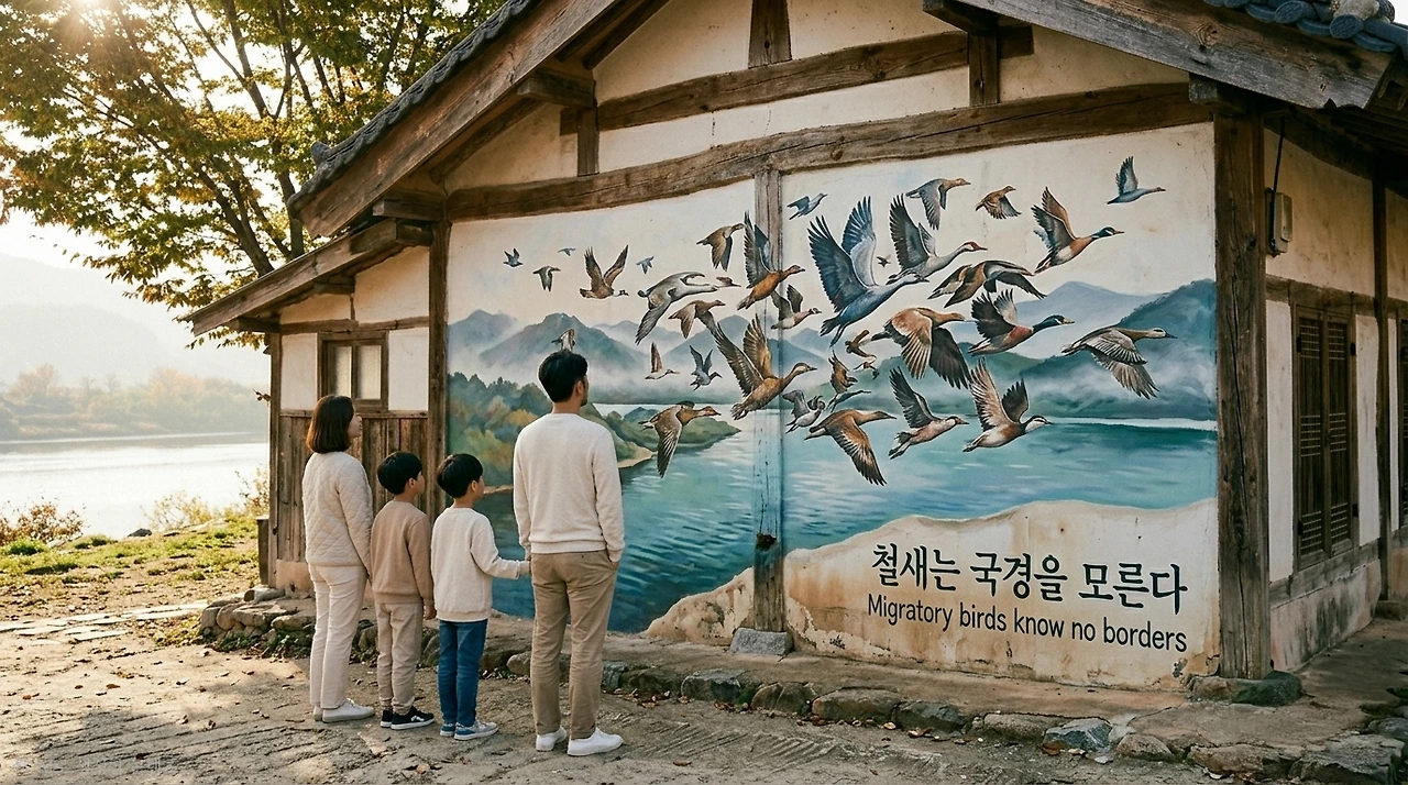 한 벽화 앞에서 멈췄다. 철새들이 임진강을 날아가는 그림이었다.