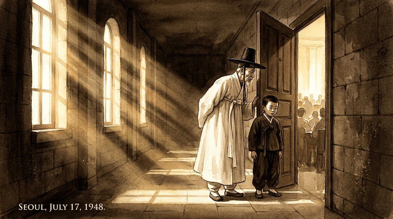 윤서진은 열다섯 살이었다. 아버지 윤병호가 제헌국회 서기로 일하는 덕에, 그는 그 날 오전 회의장 복도 끝에 서서 역사가 만들어지는 소리를 들었다. 수십 명의 의원들이 한목소리로 낭독하는 헌법 전문이 복도를 타고 흘러들었다.