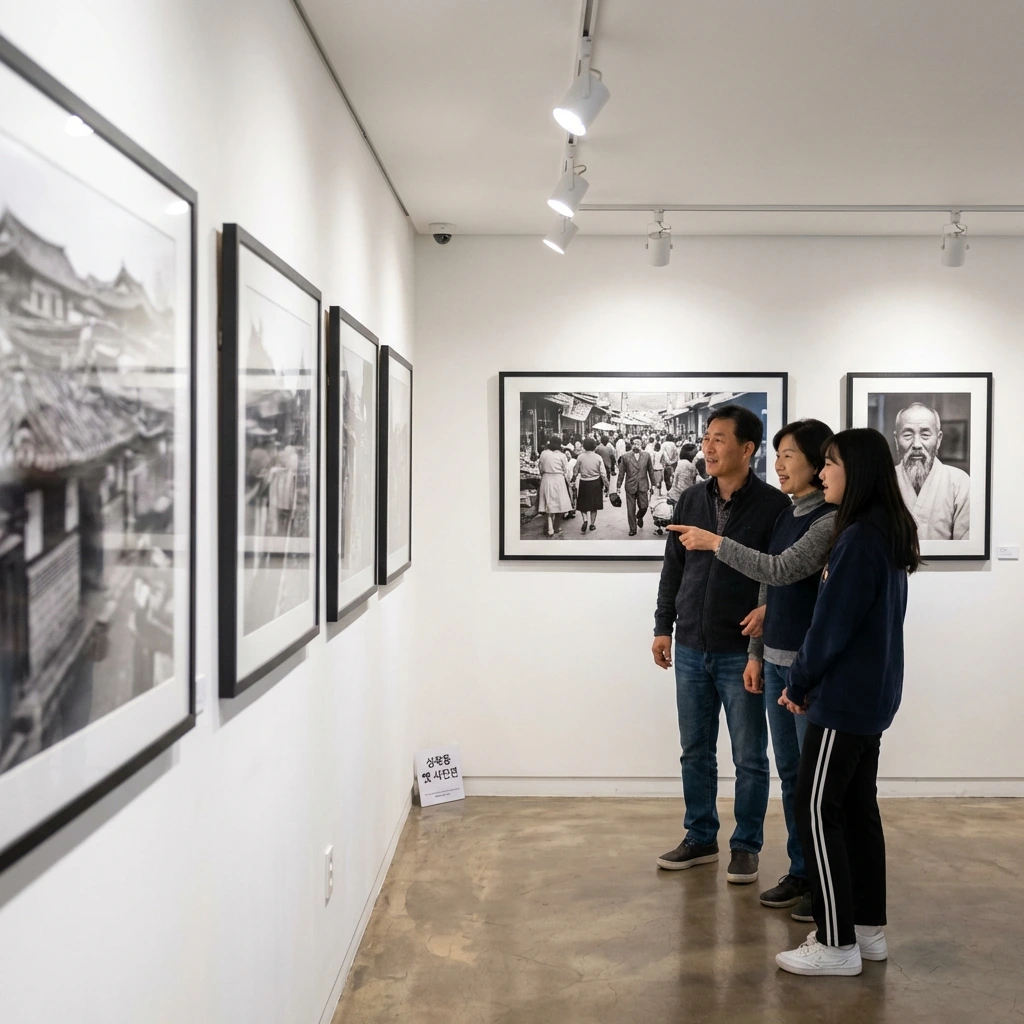 흑백 사진 속에는 한옥들, 좁은 골목, 예술가들의 모습이 담겨 있었다.