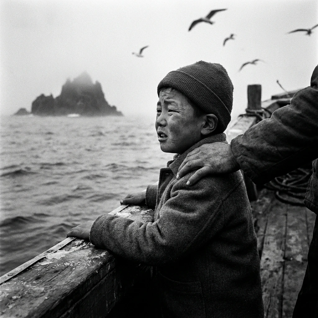 강호는 품에서 작은 것을 꺼냈다. 낡고 작은 사진 한 장. 흑백 사진. 어린 강호가 아버지 이봉출의 등에 기대어 배 위에서 잠든 사진. 배경에 독도의 검은 절벽이 보이는 사진. 어머니가 어디서 찍었는지 물을 때마다 웃으며 말했다. "누가 찍어줬겠어, 바다가 찍어줬지."
