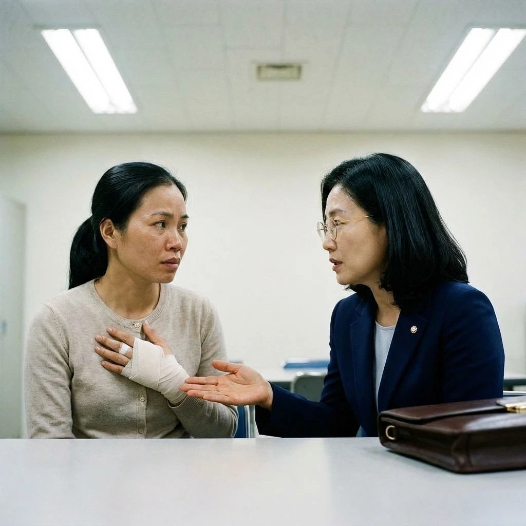 의뢰인은 응우옌 티 홍. 베트남 출신 이주노동자. 경기도 안산의 봉제 공장에서 일하다 손가락 세 개가 절단되는 사고를 당했다. 산재 신청을 했으나 고용주가 불법 고용 사실을 숨기기 위해 서류를 조작했다. 홍은 치료비도, 보상도 받지 못한 채 병원에서 혼자 누워 있었다.