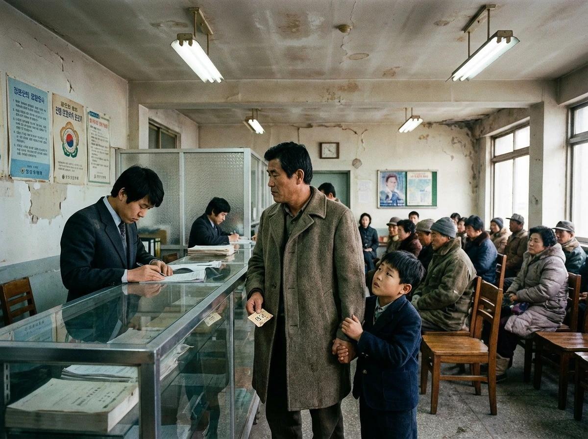 민원실에는 형광등이 깜박거렸다. 나무 의자가 줄지어 있었고, 사람들이 번호표를 들고 앉아 있었다. 아버지는 번호표를 뽑고 앉았다. 한 시간을 기다렸다. 번호가 불렸다. 창구 너머에 젊은 공무원이 앉아 있었다.
