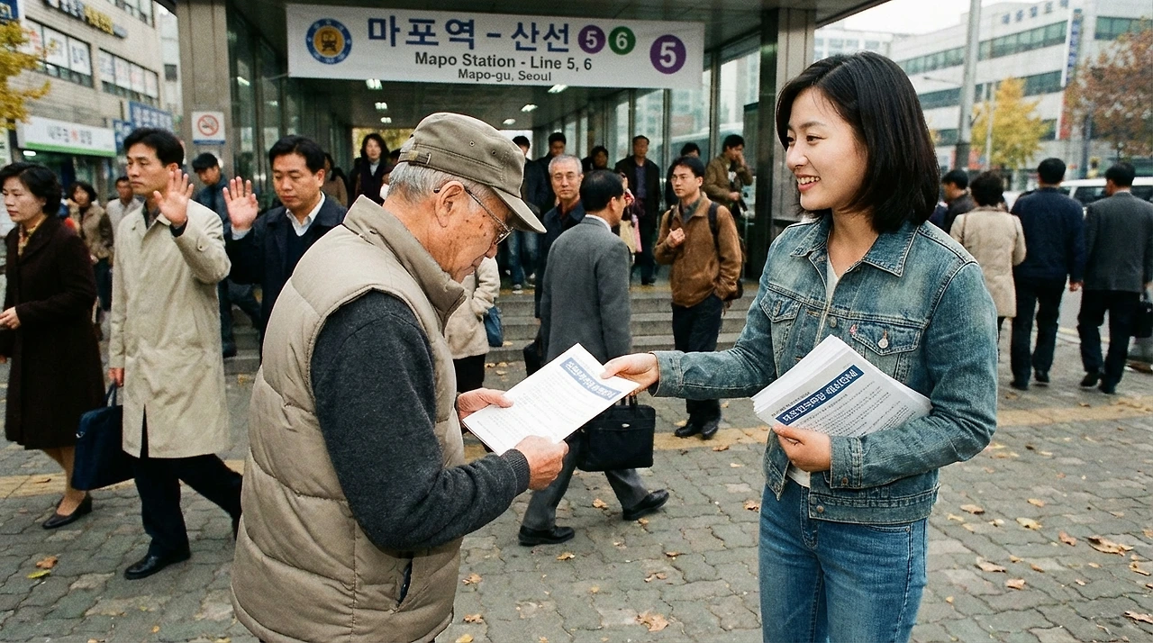 다인은 주말마다 지하철역 앞에 나가 당원 가입 안내 책자를 돌렸다. 사람들이 받지 않으려 했다. 어떤 이는 "또 정치야?" 하며 손을 저었다. 어떤 이는 "작은 데는 의미 없어요" 했다. 어떤 어르신은 받아들고 잠시 들여다보다 주머니에 넣었다.